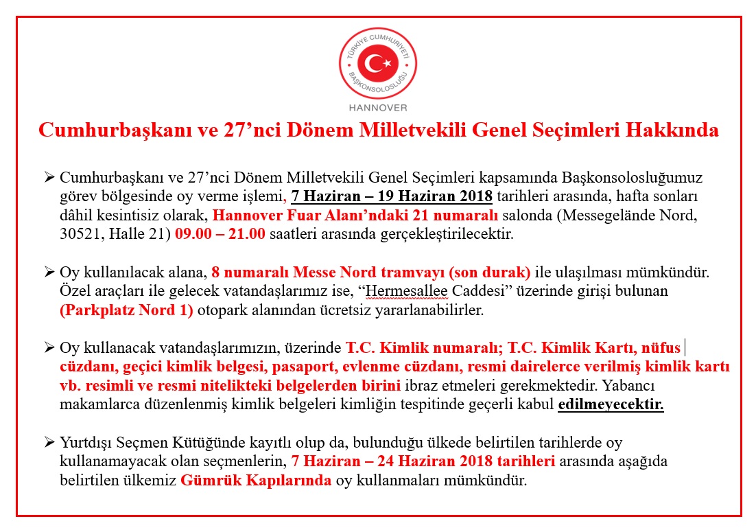 Cumhurbaşkanı ve 27’nci Dönem Milletvekili Genel Seçimleri kapsamında Başkonsolosluğumuz görev bölgesinde oy verme işlemi, 7 Haziran – 19 Haziran 2018 tarihleri arasında, hafta sonları dâhil kesintisiz olarak, Hannover Fuar Alanı’ndaki 21 numaralı salonda (Messegelände Nord, 30521, Halle 21) 09.00 – 21.00 saatleri arasında gerçekleştirilecektir.