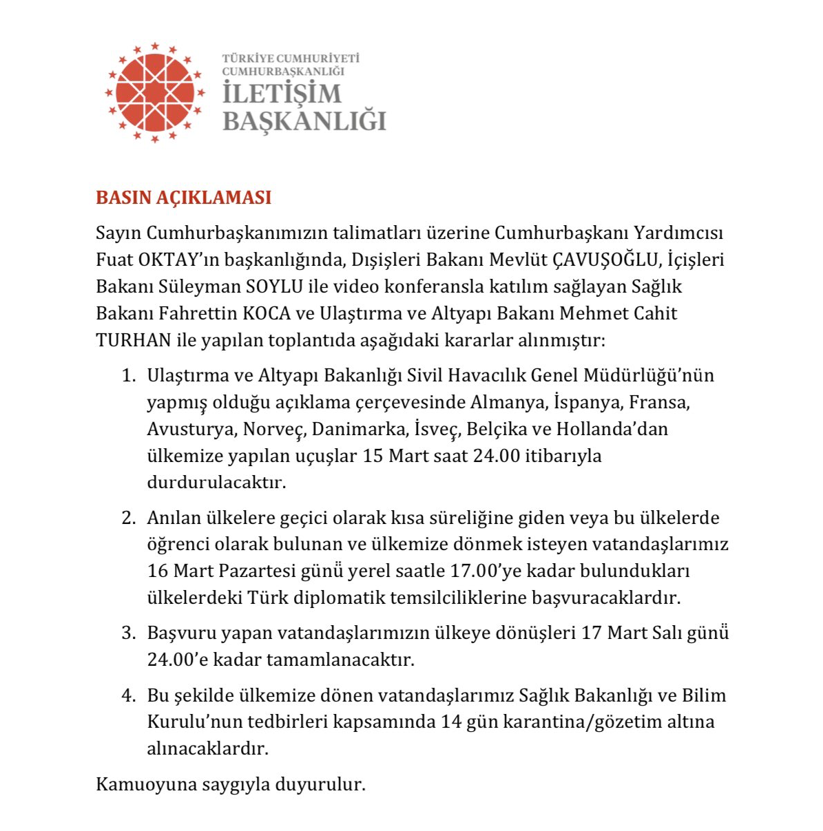 Koronavirüs salgını nedeniyle aralarında Almanya’nın da bulunduğu 9 Avrupa ülkesine yönelik uçuş yasağı bağlamında ilgili makamlarımızca alınan güncel kararlarekte sunulmaktadır.